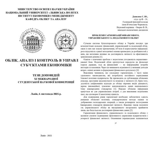 У своїй доповіді Софія презентувала дослідження на тему: «Проблеми гармонізації фінансового, управлінського та податкового обліку», яке привернуло увагу учасників актуальністю та глибиною аналітичних висновків.
