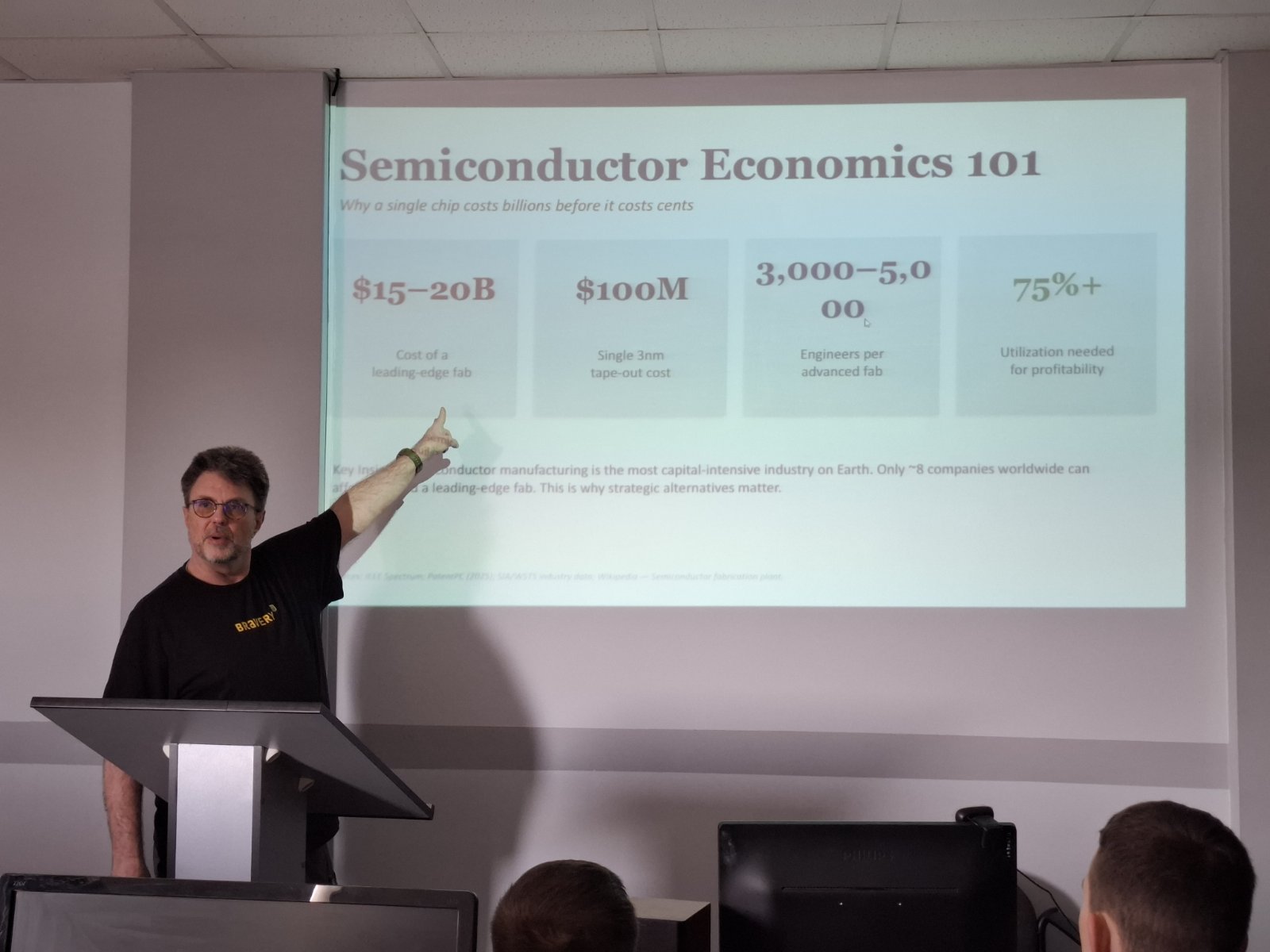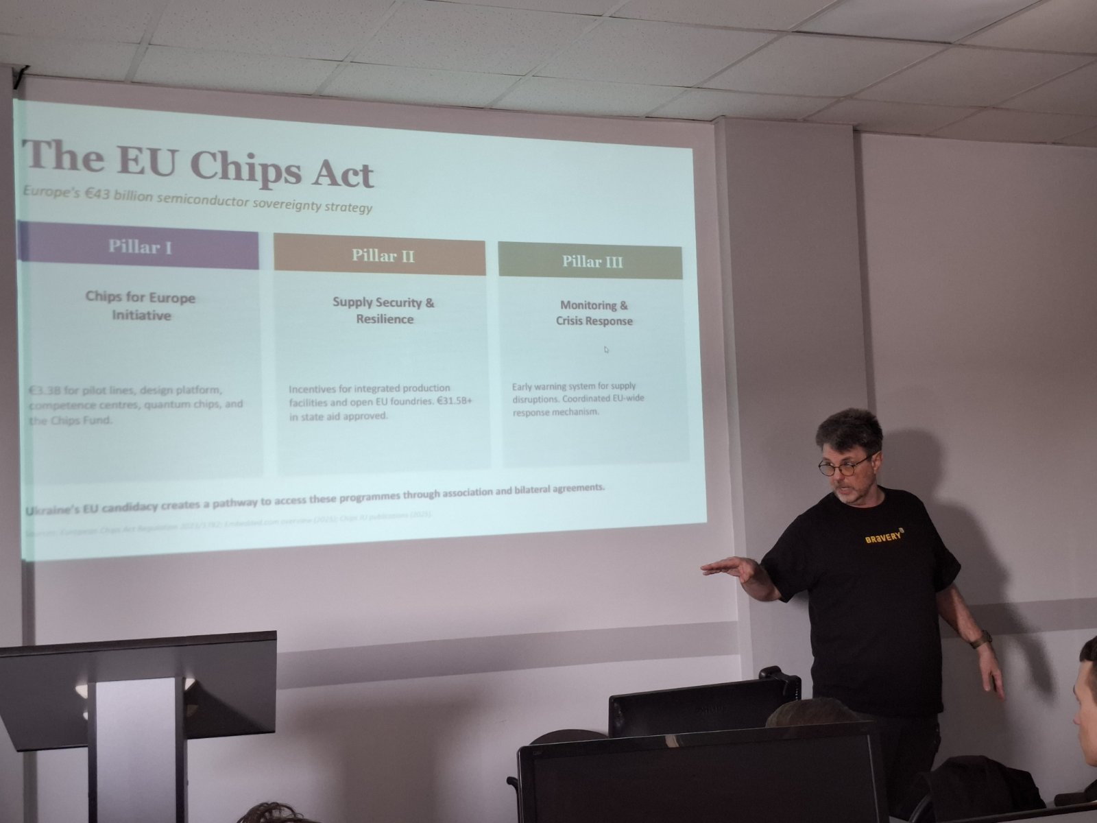 Головною темою виступу стала стратегічна дорожня карта розвитку напівпровідникової галузі України до 2026 року в контексті глобальної економіки та європейської інтеграції. Під час спілкування експерт обґрунтував доцільність фокусування України на проєктуванні інтелектуальної власності та спеціалізованих нішах (оборона, космос, критична інфраструктура), а також наголосив на можливості використання європейських пілотних ліній, зокрема APECS, для доступу до технологій прототипування без необхідності побудови дорогої внутрішньої інфраструктури.