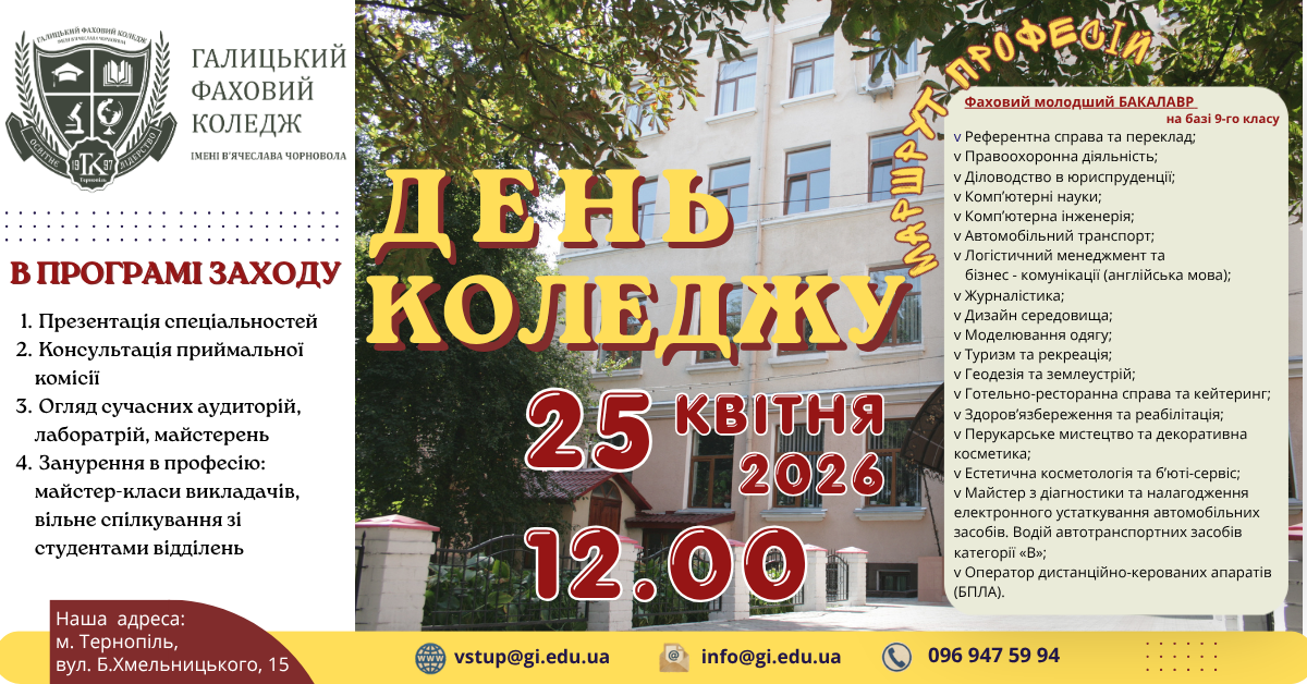 Вже цієї суботи, 25 квітня о 12:00, Галицький фаховий коледж імені В'ячеслава Чорновола запрошує майбутніх абітурієнтів, учнів та їхніх батьків на День коледжу, який пройде у форматі Дня відкритих дверей!